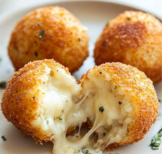 Golden, crispy risotto balls with a creamy center, bursting with gooey mozzarella in every bite.